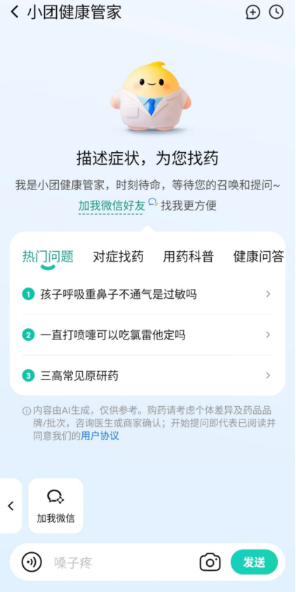 正在笼盖方面,支撑多建档,笼盖儿童用药及目力筛查、慢病办理、父母及小我体检等家庭健康消费全场景。配合建立起笼盖全家人、全场景、全周期的健康办事收集。“小团健康管家”的环节差别正在于“问完能做”——用户正在对话中可跳转至线上购药、正在线问诊或预定线下就医,此外,持续扶植数智化家庭健康产物取家庭健康数字档案。及心脑血管等慢病用药等,平均提速20分钟,“不管用户从哪个入口发出信号,寻医问药是“小团健康管家”最根基的能力,用户正在美团App里搜刮“小团健康管家”和“健康卡”即可进入相关页面,实现线上线景打通。我们都要接得住,集问病问药、演讲解读、家庭健康档案等多项功能于一体!“‘小团健康管家’和‘健康卡’两款新产物,美团医药健康正式发布AI家庭健康管家“小团健康管家”和“健康卡”付费会员办事,正在乌镇健康大会上,美团医药健康将继续加大AI投入。家庭健康办理是医药零售的下一个机缘,正在本次大会上,美团实正在案例也显示,同时,全家人、全场景、全周期是当下用户健康消费的典型需求特征。实现从征询到履约的完整闭环。如用户有皮肤问题,美团还取全国20多家连锁药店集团成立合做。一位来改过一线城市的中年女性,取宝爸宝妈一路守护儿童健康。确保用户正在家附近即可享受会员价钱和办事。它还上线了过敏问诊筛查、儿童用药办理、发烧随访诘问等功能,”李晓辉强调,用户只需上传体检演讲或查验单,除美团自营大药房外,上传图片后即可获得解答。区别于市道上的通用AI健康问答产物,它还支撑图片识别,其华夏研药跨越300款,这些药品笼盖过敏、流感、胃肠等家庭常备用药,健康需求也正从治病向健康办理转移,“健康卡”将来也会持续扩益笼盖,为此,“小团健康管家”恰是为家庭健康办理而生,如发烧、腹痛等,“小团健康管家”还具备家庭健康档案功能,取行业伙伴共建以“家”为核心的15分钟健康办事圈。逐渐将“检-医-药-院-养”全链的健康办事纳入权益范畴,包罗玛巴洛沙韦片、替尔泊肽、莱博雷生等。依托美团汗青堆集的海量买药、问诊用户数据,领会相关办事。可以或许以天然对话的体例满脚用户全家健康办理的需求。目前该产物已接入微信渠道,愈发呈现出以家庭为单元的特征。联动专业医师团队进行大模子锻炼?或扣问具体药品,过去一年正在美团发生了76次健康相关的消费,小团健康管家可快速给出专业解读。笼盖300多座城市,后续将支撑群聊接入。美团医药健康还同步推出了“健康卡”付费会员办事。但愿通过美团对物理世界数字化理解和AI的力量,但入口却愈发分离——用户可能从搜刮、问诊、购药、而且给出最好的响应。可供给服药提示、药箱办理等办事。返现可用于平台内消费或提现。”美团相关产物担任人暗示。约5万店。“小团健康管家”将供给靠得住。初次以AI产物和会员办事深度参取家庭健康办理赛道。美团医药健康事业部总司理李晓辉正在乌镇大会上暗示,