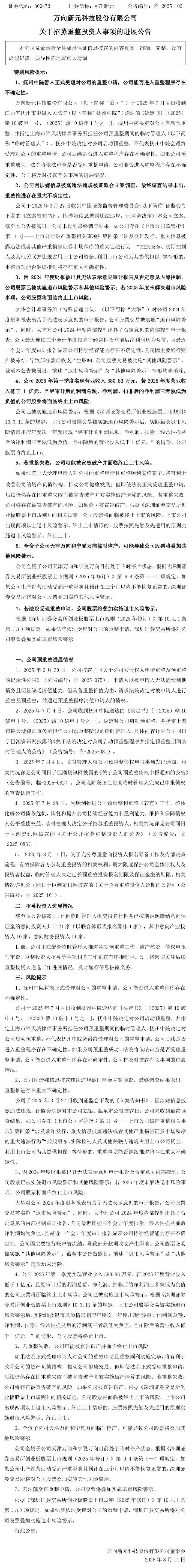 2025年8月14日晚间,*ST新元(维权)(300472.SZ)发布公告称:截至公告披露日,已向临时管理人提交报名材料并已按期足额缴纳意向保证金的意向投资人共计21家,其中,意向产业投资人10家,意向财务投资人11家。目前,公司正在配合临时管理人推进各项预重整工作,清产核资、债权申报与审查、重整投资人招募等各项相关工作正在有序推进中。